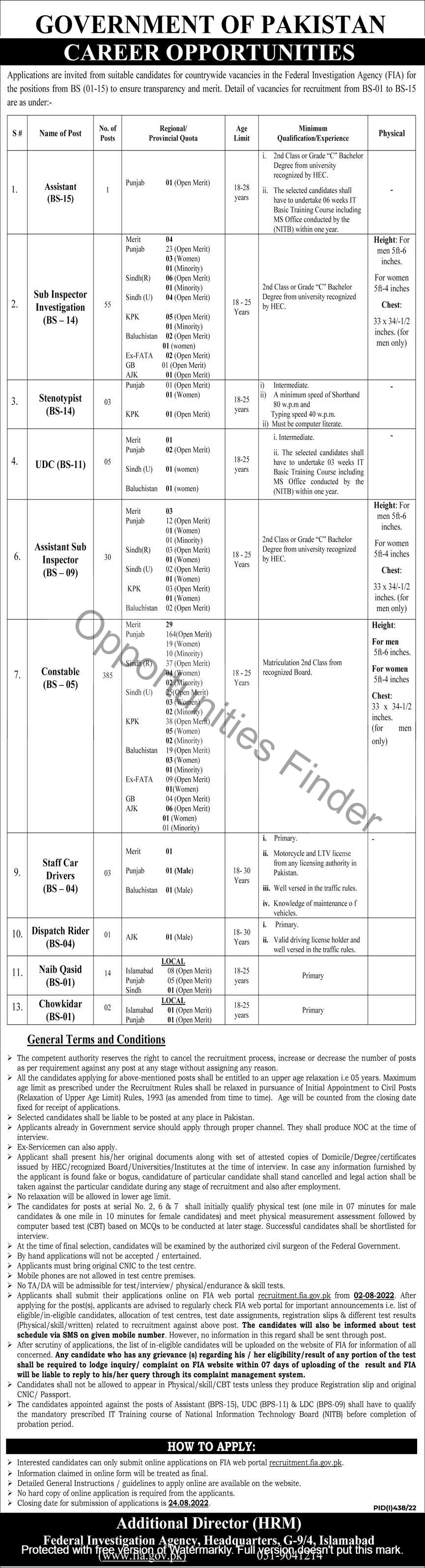 Gear up applicants who wanted to apply for government jobs as applications are open in Federal Investigation Agency. Applications are invited to the Federal Investigation Agency FIA. These FIA jobs are officially advertised in the daily express newspaper on 24th July 2022. These posts are for the positions of sub-inspector, assistant, stenotypist, Naibqasid, drivers, and others. 300 posts are announced just for the sub inspector’s positions. Grab this golden opportunity and prepare yourself for these posts.